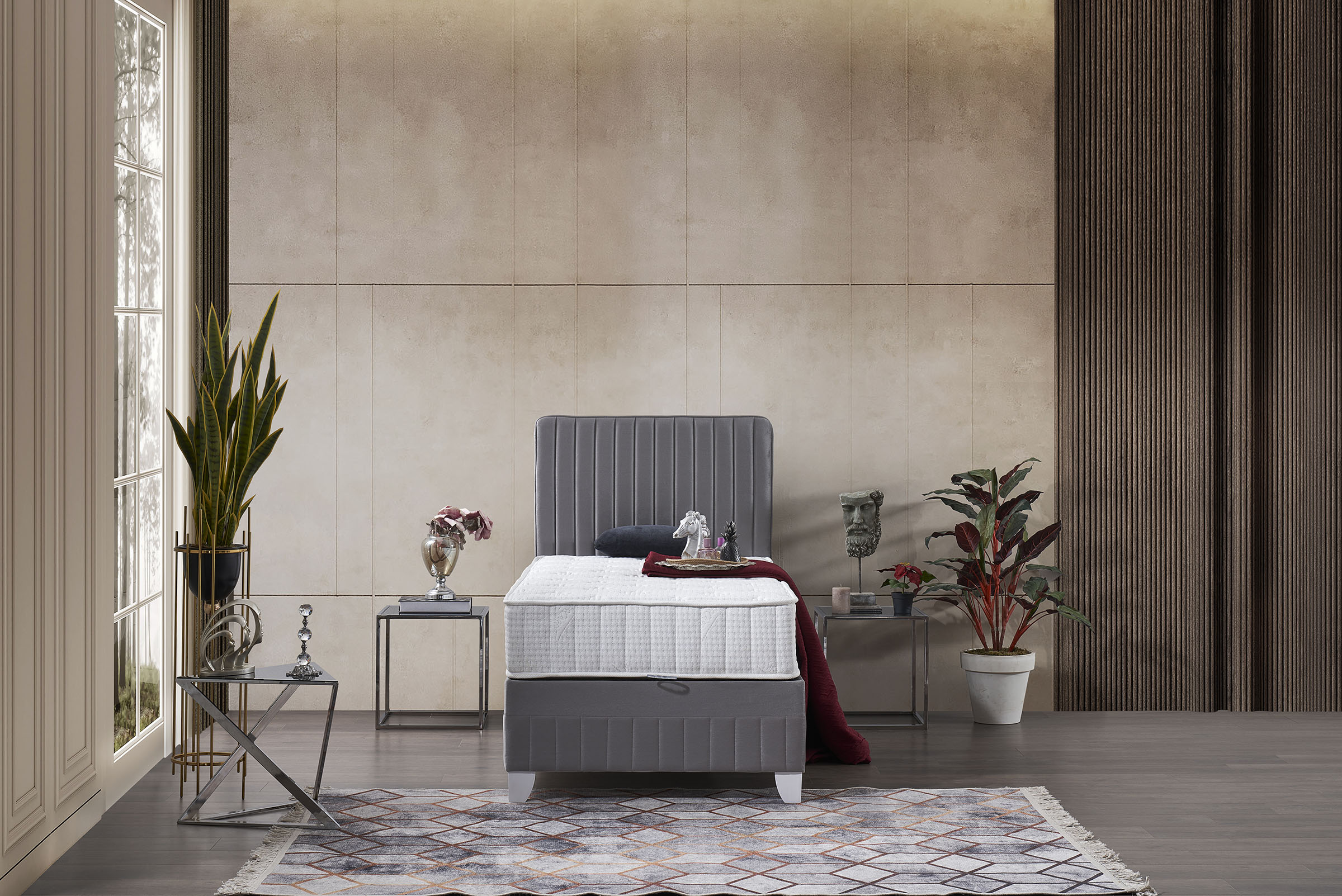 Yumuşak tonları ve dengeli yapısıyla uyku alanında huzurlu bir atmosfer oluşturur. Gecenin her anında rahatlığı destekleyen yapısı, dinlenmeyi sakin bir ritme dönüştürür.