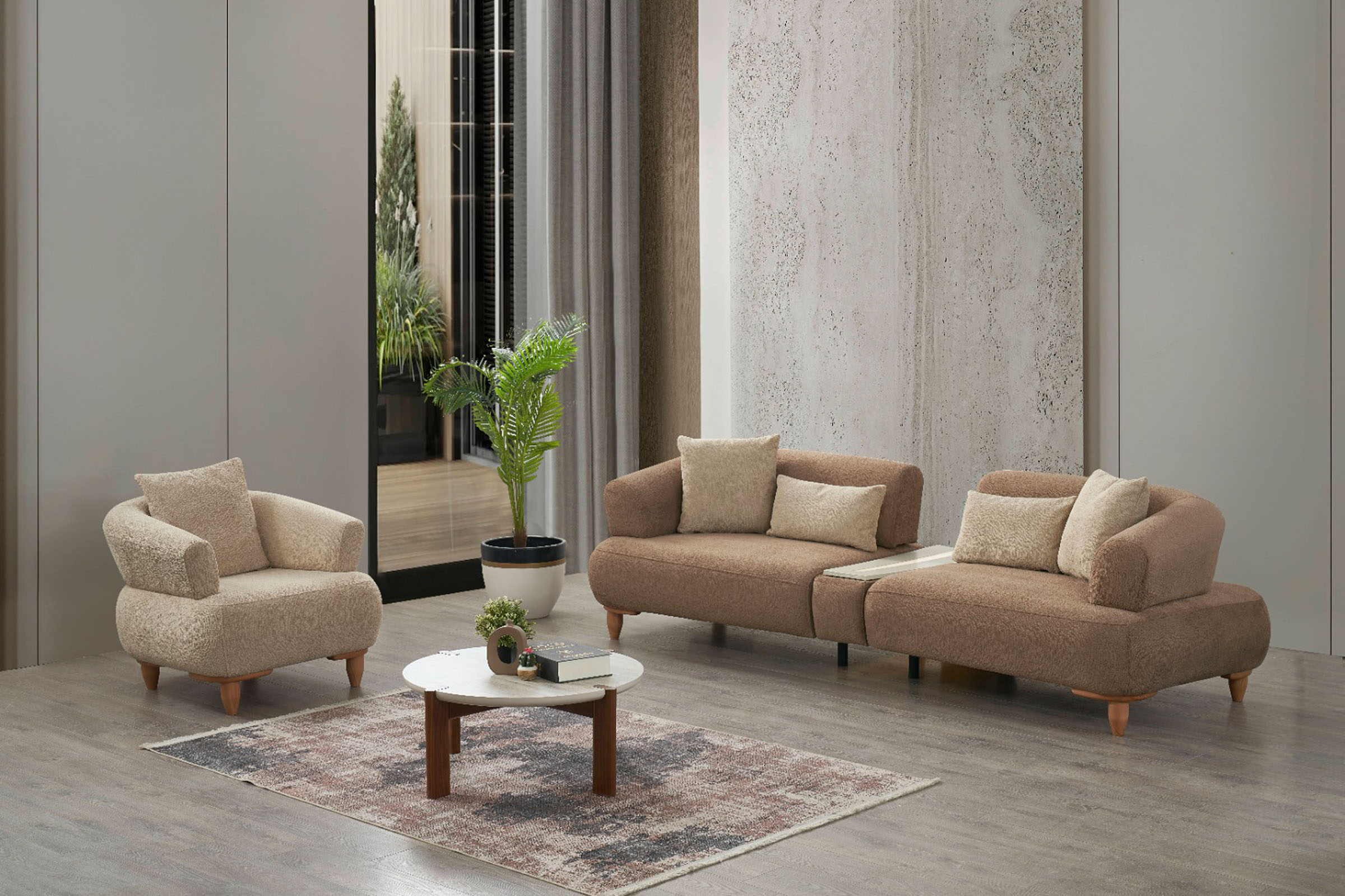 İnce ve akıcı formu sayesinde mekânda hafif bir etki yaratır. Rahatlığı doğal bir zarafetle tamamlayan sade bir ifade sunar.